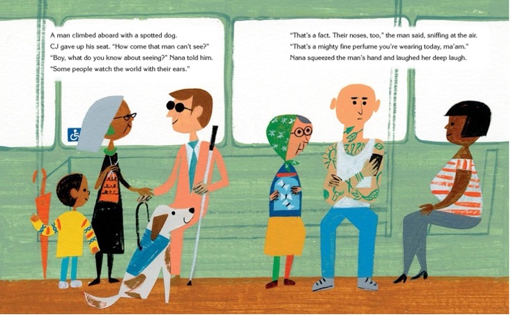 Last Stop on Market Street (2015), written by Matt de la Peña and illustrated by Christian Robinson, follows a young boy named CJ as he rides the city bus with his grandmother through their urban neighborhood. Along the way, CJ notices the people, sights, and sounds around him, asking questions about what he sees. His grandmother guides him, pointing out details in the city and helping him understand the everyday life and diversity of their community. As they travel from stop to stop, CJ observes different neighborhoods and interacts with fellow passengers, gradually discovering new aspects of the world he had overlooked. The narrative follows their journey through the city, capturing the sights, interactions, and small moments that reveal the vibrancy and richness of life in an urban environment.