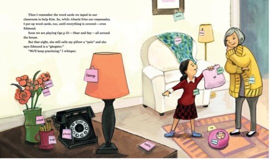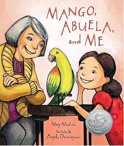 Mango, Abuela, and Me (2015), written by Meg Medina and illustrated by Angela Dominguez, follows a young girl named Mia who moves to a new city with her family. Mia’s grandmother (Abuela) comes to live with them, but she speaks Spanish while Mia speaks mostly English, so the two struggle to understand each other at first. Mia feels lonely and unsure how to connect with Abuela. One day, Mia decides to take Abuela out in the stroller and they begin to explore the neighborhood together. As they share these outings, Mia and Abuela start learning each other’s words and routines, gradually finding ways to communicate. The narrative follows their growing connection and the small everyday moments that help bridge the language gap between them.