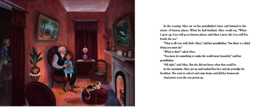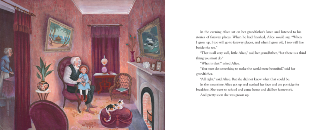 Miss Rumphius (1985), written and illustrated by Barbara Cooney, tells the life story of Alice Rumphius, a woman who dreams of traveling to faraway places, living by the sea, and making the world more beautiful. Encouraged by her grandfather, young Alice grows up with a sense of curiosity and wonder for the world around her. As an adult, she becomes a librarian, learning about distant lands through books before setting off on her own adventures. Her travels take her across tropical islands, mountains, and deserts, where she meets diverse people and experiences the beauty of the world firsthand. After an accident forces her to stop traveling, Alice settles in a small seaside house. There, she begins to plant lupine seeds around her home.