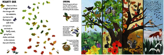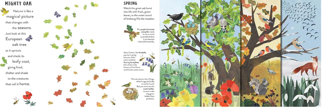 Seasons (2021), written by Hannah Pang and illustrated by Clover Robin, follows the changes that occur in six different landscapes around the world throughout the year. The book takes readers on a journey through the Arctic tundra, African plains, Australian creeks, and other environments, showing how each location transforms with the seasons. Pages are designed to reveal differences as readers turn them, allowing them to observe shifts in weather, plant growth, and animal activity from spring to winter. In each setting, animals appear, plants grow and fade, and the environment responds to the changing climate. The narrative focuses on the cyclical patterns of nature, highlighting how landscapes evolve over time. By moving from one location to another, the story shows the diversity of seasonal changes in different parts of the world.