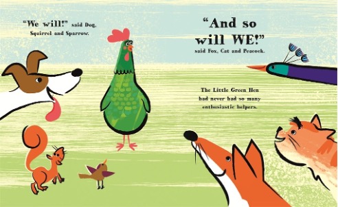 The Little Green Hen (2018), written and illustrated by Alison Murray, follows a hardworking hen who lives inside an old apple tree and spends her days caring for her home. She tidies, prunes, and nurtures the environment around her, always looking for help with her tasks. Various animals pass by, each responding differently to her invitations. As the seasons shift, the hen continues maintaining the tree and the space around it, preparing for whatever changes nature might bring. When a major weather event approaches, the animals’ choices influence how they face the situation, and the story brings them together inside and around the tree. The book highlights the characters’ interactions as they work through the challenges presented by their shared environment.